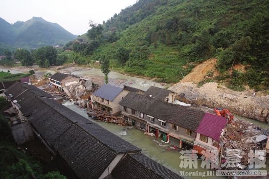 2014年7月4日晚上10点40分许,受持续强降雨作用,湖南省怀化市新晃侗族自治县米贝苗乡集镇农贸市场对岸(南岸)山体发生滑坡,滑体方量约5万m3。滑坡快速下滑后造成正对岸部分民房冲击毁塌并堵塞坡脚中和溪,形成库容达12万m3的堰塞湖,洪水位快速上升导致左岸农贸市场及民房受淹。滑坡致1人遇难。
