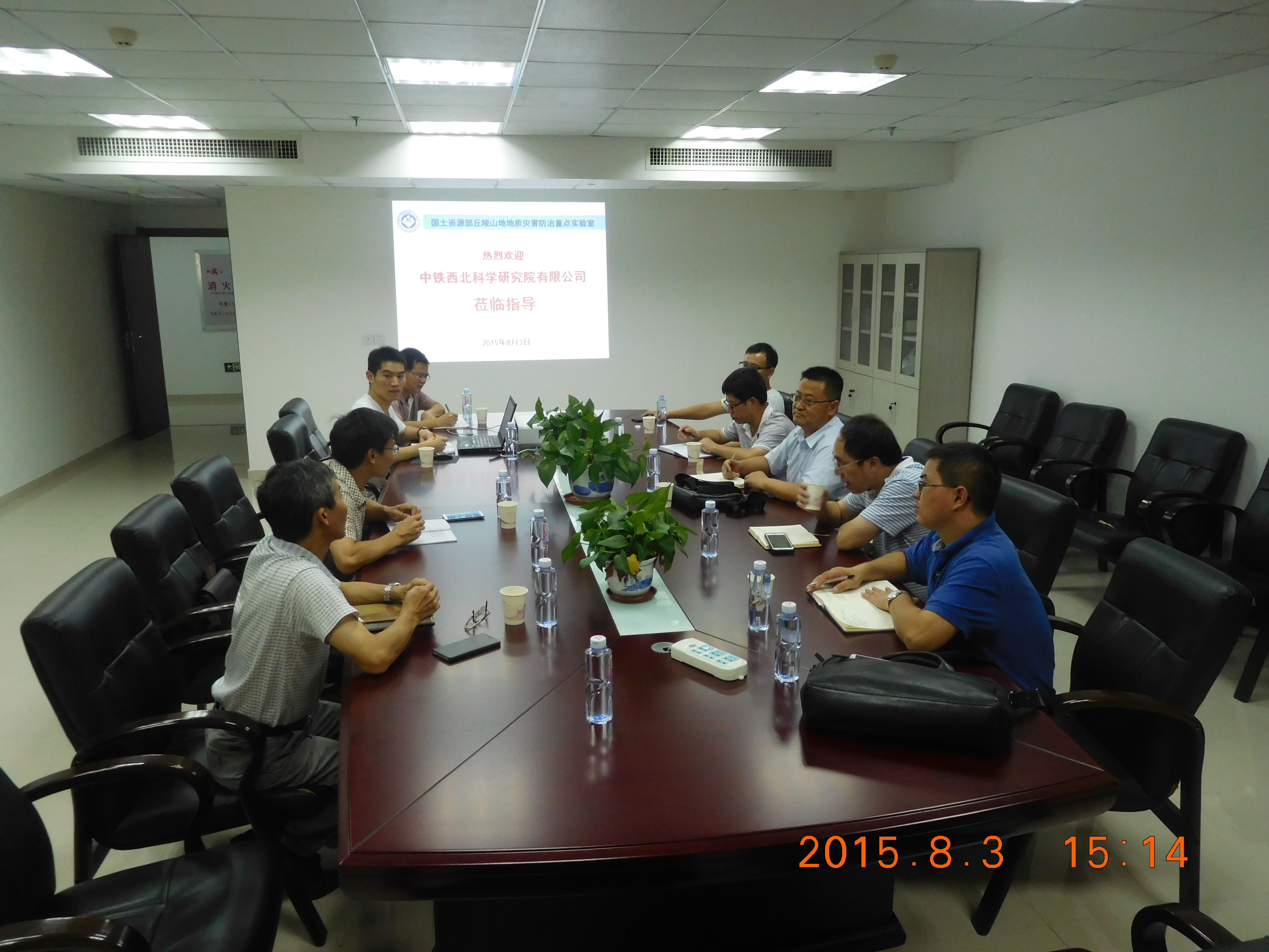 2015年8月3日,中铁西北科学研究院有限公司副总经理兼总工程师熊治文博士、廖小平研究员一行5人莅临重点实验室参观交流。重点实验室常务副主任(省工勘院副院长)柳侃热情接待来宾一行。