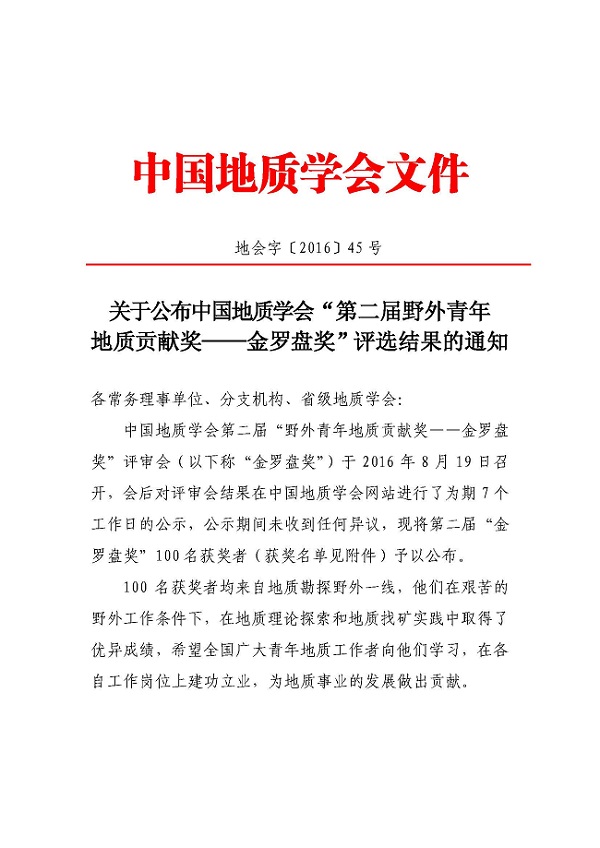 金罗盘奖是由中国地质学会联合国土资源部地质勘查司、科技与国际合作司、人事司共同设立的,从2014年度开始评选,每两年评选一次,每届评选100人。该奖项旨在鼓励野外一线青年地质工作者立足基层、扎根野外、求真务实,恪守奋发进取、勇创一流的科学精神,促进更多野外优秀青年地质人才脱颖而出。