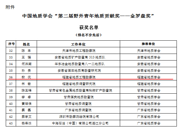 今年5月,由福建省地质学会推荐,经资格审查、会议评审、网站公示,柳侃同志最终获得第二届金罗盘奖殊荣,是福建省两位获奖者(另一位为福建省地质调查研究院林敏)之一。