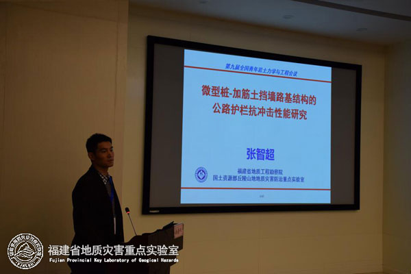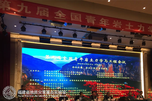 2016年11月10-13日,第九届全国青年岩土力学与工程会议在重庆召开。500余名来自全国各地的岩土力学与工程领域著名专家与青年学者参加了会议。本次会议主题为“岩土工程灾害与控制”。会上,福建省地质灾害重点实验室张智超博士作了《微型桩-加筋土挡墙路基结构的护栏抗冲击性能研究》专题报告。报告通过数值计算,论证所开发护栏加固系统的优越性,可有效提高护栏防撞性能。报告内容得到与会代表的广泛关注。