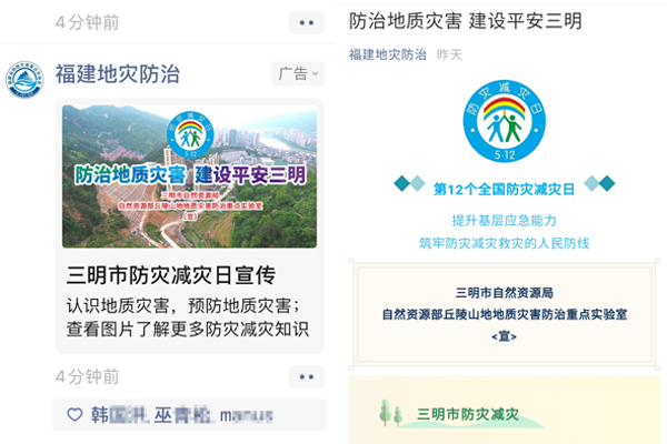 5月12日,地质灾害重点实验室联合三明市自然资源局,开启主题日“云活动”,线上浏览人次超过60万。通过“福建地灾防治”微信平台推广,回顾2019年三明市地质灾害防治工作成效;展示高清航拍影像,对比2019年“5·16”和“6·5”洪灾中发生地质灾害重点区域今夕面貌,以综合治理后坚固美观的边坡加固工程为老百姓送上“定心丸”;延伸介绍地质灾害分类、发生发展早期迹象、逃生避险正确方式等实用小知识,筑牢基层群众的防灾避灾基础意识。