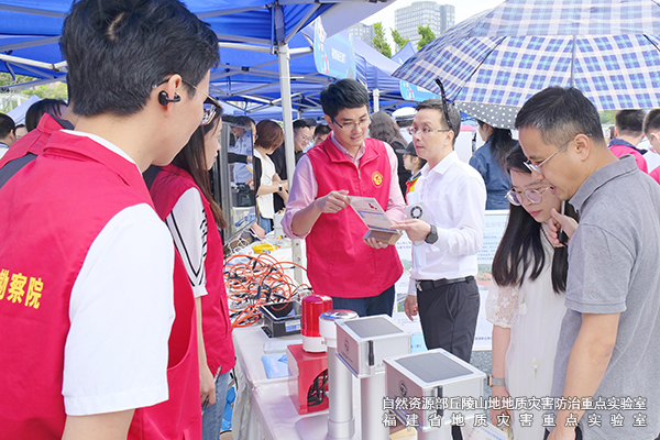 5月11日,实验室参加了2025年福建省“全国防灾减灾日”主会场活动。在福州市晋安湖公园,实验室科普志愿者向市民群众展示并介绍了电阻率测深式土壤含水率监测仪、拉线地表位移监测仪、地表倾斜监测仪、雨量监测仪等多种自主研发的高精度地灾监测预警系列设备;并结合地质灾害防治科普短片、宣传展板和手册,为大家普及地质灾害基本知识。市民、学生代表认真聆听讲解,积极参与专业设备互动体验,全方位提升应急避险能力水平。同时,实验室还精心编制了群发性地质灾害相关科普文章,120余家省、市、县权威媒体争相推送及转发。
