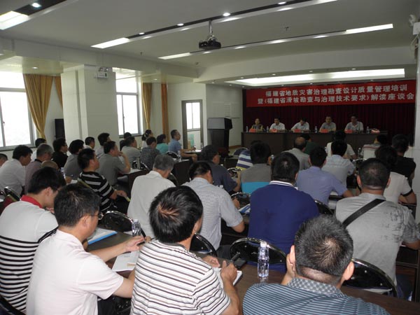 2013年7月12日,由福建省国土资源厅主办、福建省地质矿产勘查开发局协办,福建省地质工程勘察院、福建省地质灾害重点实验室承办的“福建省地质灾害治理勘查设计质量管理培训暨《福建省滑坡勘查与治理技术要求》解读座谈会”在福建省地矿大厦19楼会议室顺利举办。参加本次大会的各级单位共计39个,包括全省9个设区市国土资源局、平潭综合实验区国土与环保局及部分县、乡镇国土资源局、所,以及承接全省地质灾害治理勘查设计项目的资质单位,参会总人数共计181人。