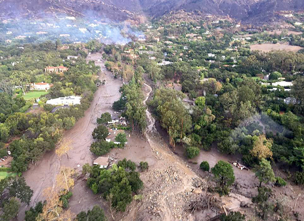据悉,此次泥石流灾情最严重的圣芭芭拉县正是前不久加州史上最大山火——托马斯大火侵袭的区域。2017年12月4日晚间爆发的大火无情烧毁了28.2万英亩(约合1141平方千米)土地,使得土地蜡化,区域生态环境极其脆弱。8日凌晨,加州南部突发强降雨,短短5分钟降雨量就高达0.5英寸(约1.27厘米),而据官方称,雨量每小时0.5英寸左右就足以导致滑坡和泥石流。失去地表植被的拦截和下渗渠道,倾盆大雨迅速在山坡上汇流成为洪水,裹挟泥沙和巨石,一路畅通无阻横扫山下城镇,造成惨重损失。